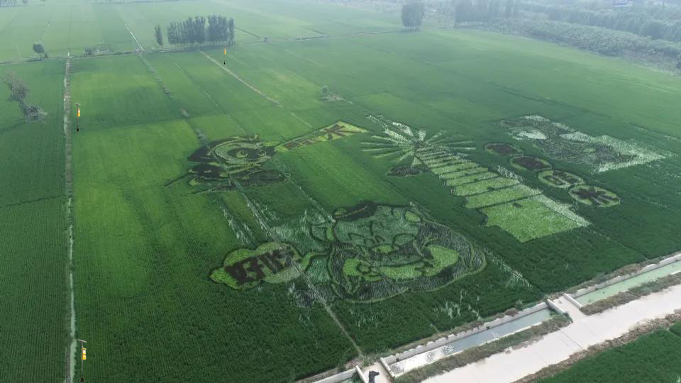 在平原示范區(qū)原武鎮(zhèn)西合角村平坦開闊的稻田里,農(nóng)民以稻田為“畫布”,以彩稻為 “畫筆”,共同繪制“鄉(xiāng)村振興”和“建黨100周年”“豬八戒吃大米”主題稻田畫。從空中俯瞰,綠色的田野里,好似繡上了一幅精美的字畫。風(fēng)吹稻浪、稻花芬芳,一片片朝氣蓬勃的“幸福綠”里,承載著農(nóng)業(yè)人的汗水和秋收的期望。